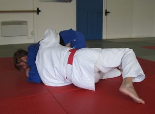 Va notato la posizione del braccio sinistro di tori (dietro il collo di uke – vedi foto 1), della testa di tori (foto 2), la gamba di rotazione e il movimento di controllo con il braccio sinistro che si distende dietro il collo di uke (vedi foto 3) per concludere con una immobilizzazione estremamente potente (foto 4).