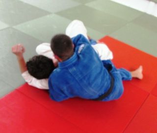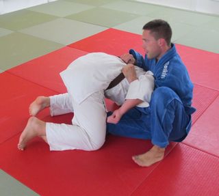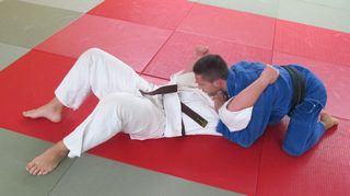 Nella foto 3 si vede la posizione di arrivo. E' importante che le mie gambe non vengano bloccate sotto il corpo di uke. Da qui blocco con la presa la testa e le spalle del mio avversario e mi allontano con le gambe.