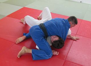 La foto 4 si riferisce alla posizione d'arrivo: immobilizzo uke in yoko-shiho-gatame. La mia mano destra resta in presa alla cintura, la sinistra invece resta libera di muoversi per impedire i tentativi di liberazione di Uke.