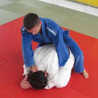 Nella foto 4 immobilizzo in kuzure-kami-shio-gatame. La mia mano sinistra resta in presa e schiaccia verso il basso, la destra può rimanere al colletto o può afferrare la testa di uke.