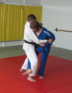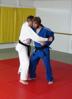 Osservando la sequenza di foto proposte, notate come mi avvicino ad uke tirando la sua manica destra verso il mio corpo. Dopodiché entro a contatto “spalla contro spalla”, mantenendo la presa alla manica in tensione e avvolgendo il piede destro di uke all’altezza del polpaccio, per falciarlo velocemente. Attenzione: questa è la mia variante preferita ! Nell’esecuzione classica ci viene insegnato a spazzare il tallone destro di uke con la pianta del piede destro, ma (a mio avviso) così facendo il colpo risulta molto meno efficace. Preferisco quindi andare a colpire il polpaccio di uke e, nello stesso tempo, continuando a tirare la sua manica destra verso il basso, investirlo con la parte superiore del corpo. Il mio braccio destro, in presa al bavero sinistro, andrà a spingere uke all’indietro, aumentando in conseguenza la forza dell’impatto.