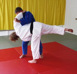 Difesa yawara. Indietreggiando con la gamba sinistra lascio che uke raggiunga la mia gamba destra ormai scarica (foto 3). Di seguito ruoto verso sinistra legando a me l’avversario.